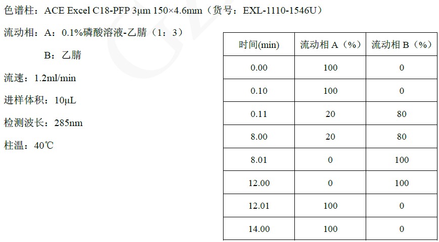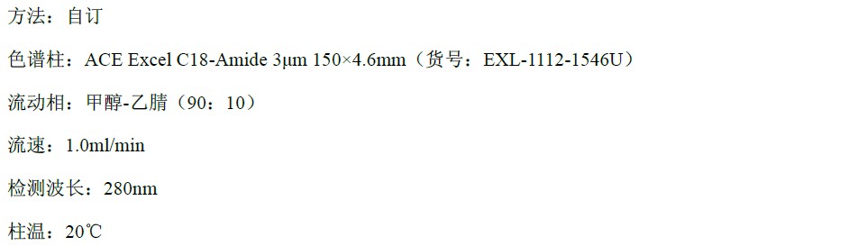 國標中用的是C30柱,水/甲醇的流動相體系,30 min的梯度方法,我們使用ACE C18-PFP,用磷酸溶液/乙腈體系,14 min的梯度方法就可以實現(xiàn)目標成分的分離,總體更節(jié)約分析時間。