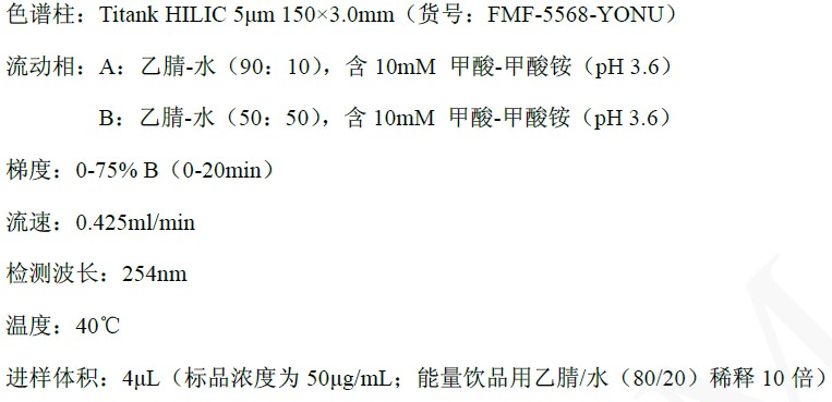 國標中用的UPLC的酰胺基柱(1.7u,150*3.0mm)或者HPLC的Si 60硅膠柱(5u,250*4.6mm),以適配不同實驗室的儀器條件。