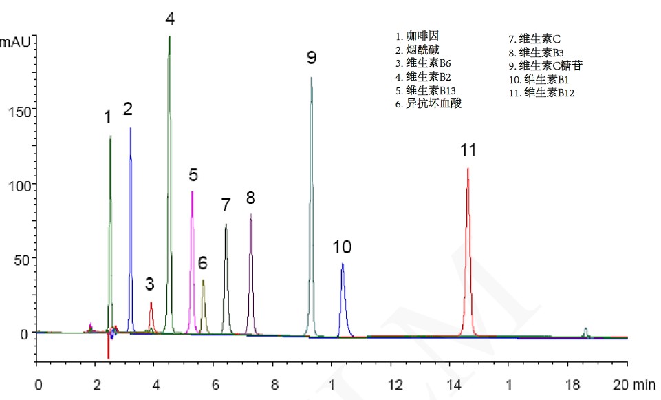 另外,對于大極性的水溶性維生素,也有用HILIC柱來分析,如使用TitanK HILIC來分析能量飲品中的水溶性維生素(混標):