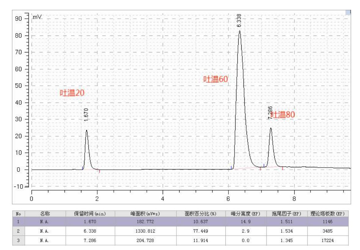 說明:Mercury Tween 吐溫專用色譜柱可實現(xiàn)吐溫 20,吐溫 60 和吐溫 80 的一次性分析,峰形良好。