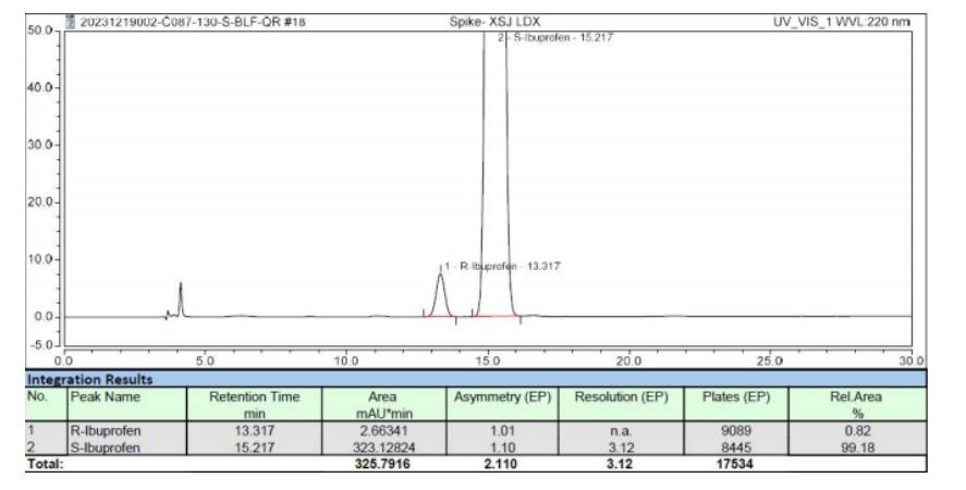 方法說明:該款反相手性色譜柱相比其它的正相方法,采用簡單的反相流動相體系,更為實用方便。峰形對稱,柱效高。藥典要求理論板數(shù)按右布洛芬峰計算不低于 2000,右布洛芬峰與左布洛芬峰之間的分離度應(yīng)大于3.0,此反相方法也完全符合藥典的指標要求。