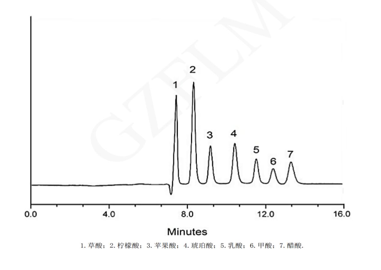 色譜柱:Mars MOA 10μm 300×7.8mm(貨號(hào):FMH-1138-KONU) 流動(dòng)相:2.5mM H2SO4 流速:0.6ml/min 進(jìn)樣體積:10μL 檢測(cè): RID 柱溫:80℃