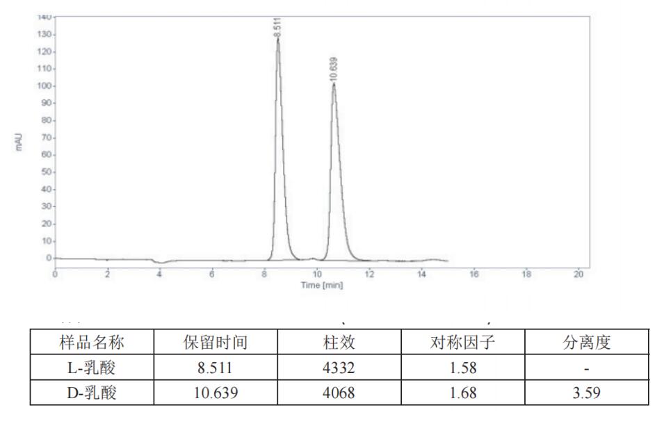 色譜柱2的方法也完全符合國(guó)家以下標(biāo)準(zhǔn): A.GB1886.173-2016關(guān)于食品添加劑乳酸D,L異構(gòu)體的檢測(cè)用柱要求 B.GB25555-2010 關(guān)于食品添加劑乳酸鈣的D,L異構(gòu)體的檢測(cè)用柱要求