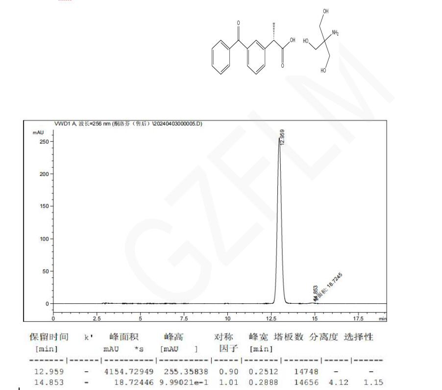 App ID: FLM-B240003 右旋酮洛芬氨丁三醇手性拆分 色譜柱:Chiral NQ(2)-RH 5μ 250*4.6mm 貨號(hào):FMG-AC5-A06-R 流動(dòng)相:反相 (詳詢銷售代表) 流速:1 mL/min 檢測(cè)波長(zhǎng):256nm 柱溫:25℃ 樣品濃度:1mg/mL,純水溶解 進(jìn)樣量:2ul ![]() |