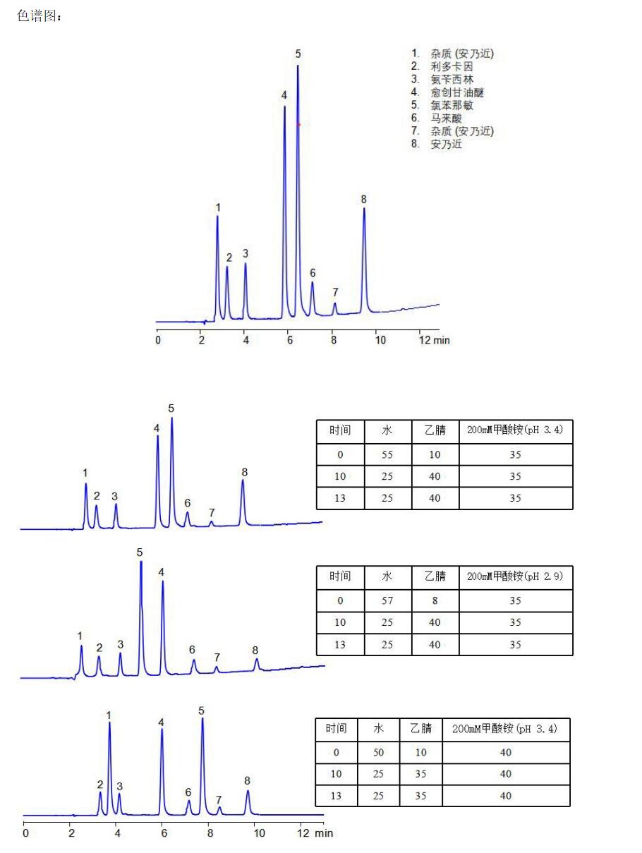 App ID: FLM-C240008 Comixsil RP-AX 同時(shí)分析鎮(zhèn)痛類藥物制劑安乃近、利多卡因、愈創(chuàng)甘油醚、馬來(lái)酸氯苯那敏、氨芐西林 色譜柱: Comixsil RP-AX 3μm 150*4.6mm(貨號(hào):FMF-AXR3-EONU) 流動(dòng)相: 時(shí)間 水 乙腈 200mM 甲酸銨(pH 3.4) 0 55 10 35 10 25 40 35 10.01 55 10 35 20 55 10 35 流速:1.0 mL/min 檢測(cè)波長(zhǎng):255nm 柱溫:25℃ 樣品濃度:N/A 進(jìn)樣量:N/A 結(jié)構(gòu)式: