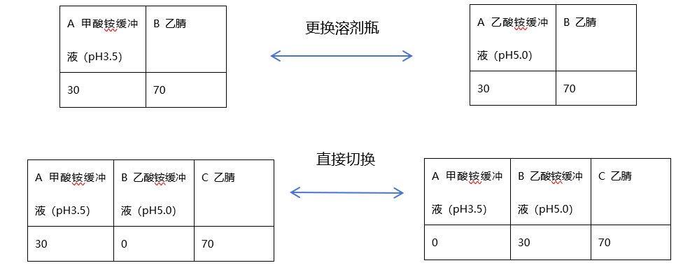 Part 2 三元泵相比二元泵的優(yōu)勢 1. 便于對比不同種類或pH的流動相 在開發(fā)一個新的分析方法時,通常需要篩選不同的溶劑組合以找到最佳分離效果。例如,可能需要嘗試: 不同pH的緩沖液:比如甲酸銨緩沖液(pH3.5)和乙酸銨緩沖液(pH 5.0)。 不同的有機相:比如甲醇和乙腈,它們的洗脫強度和選擇性不同。 對于二元泵,如果你想從“乙腈-甲酸銨緩沖液(pH3.5)”切換到“乙腈-乙酸銨緩沖液(pH 5.0)”,你必須手動更換泵B的溶劑瓶,并從泵A的瓶子中倒掉舊的緩沖液,更換新的緩沖液。這需要停機、沖洗系統(tǒng)、重新平衡,非常耗時且容易出錯(如產生氣泡、殘留污染)。
