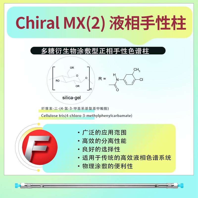 Chiral MX(2)-RH反相手性柱的固定相為纖維素-三-(4-氯-3-甲基苯基氨基甲酸酯)(Cellulose tris(4-chloro-3-methylphenylcarbamate))。這種固定相具有高效的手性識(shí)別能力,能夠?qū)Σ煌墓鈱W(xué)異構(gòu)體進(jìn)行有效的分離。