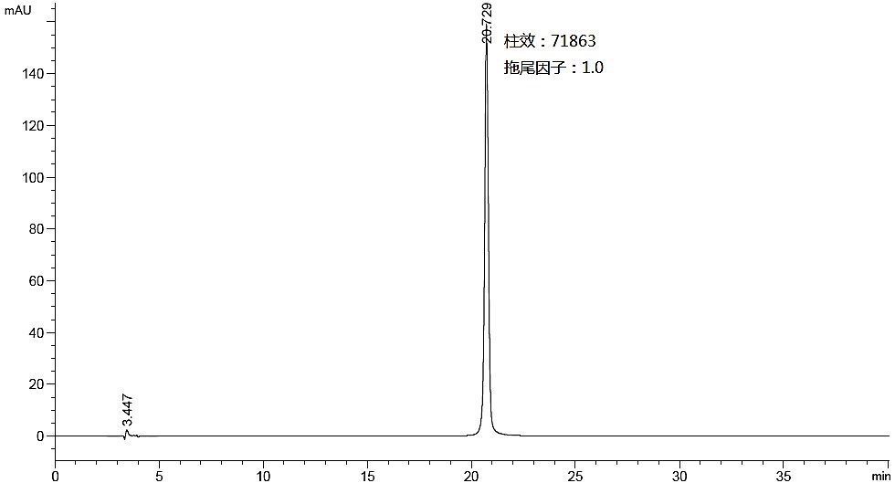 注:下圖中對(duì)照品溶液用 50%乙醇溶解并稀釋,如用藥典中規(guī)定的 70%乙醇作為溶劑會(huì)產(chǎn)生一定的溶劑效應(yīng),柱效會(huì)相應(yīng)降低至 59771(藥典規(guī)定應(yīng)不低于 20000),USP 拖尾因子為 0.91。